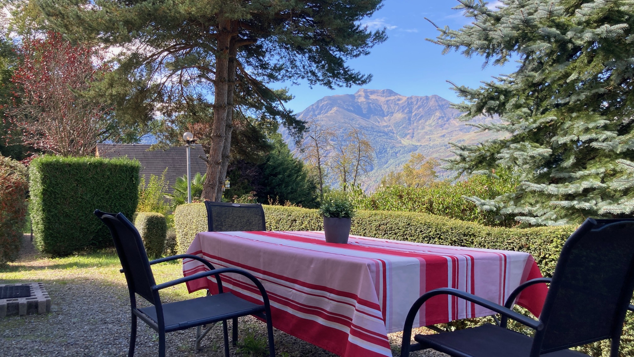Le séjour avec une cheminée insert, un fauteuil et un canapé de deux places ouvre sur sa terrasse privative avec une magnifique vue sur la vallée d'Argelès-Gazost.